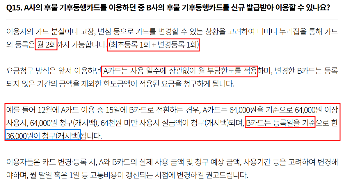 월 부담 한도 이상 사용하는 경우는 정해진 월 부담 한도 요금만 청구(신한, 국민, 삼성, 롯데카드) 또는 사용 금액을 전체 청구 후 다음달에 환급 또는 카드값 할인 등 캐시백(비씨, 하나, 농협, 현대카드)이 적용됩니다.