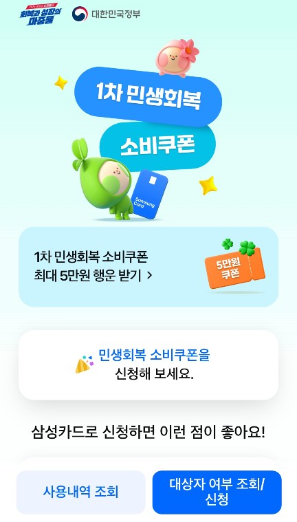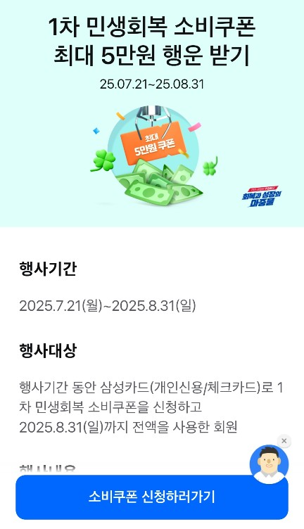 - 대상 : 행사기간 동안 삼성카드(개인신용/체크카드)로 1차 민생회복 소비쿠폰을 신청하고 2025.8.31(일)까지 전액 사용한 회원