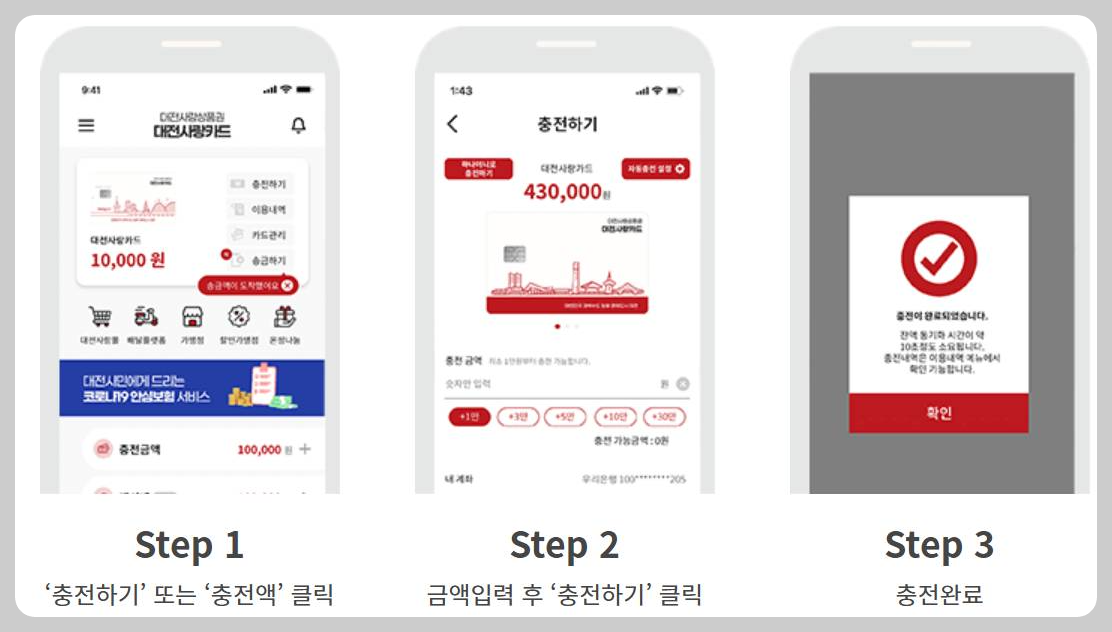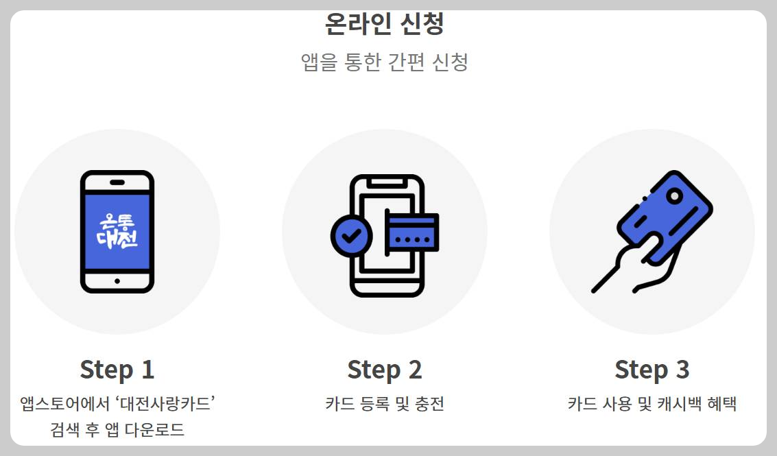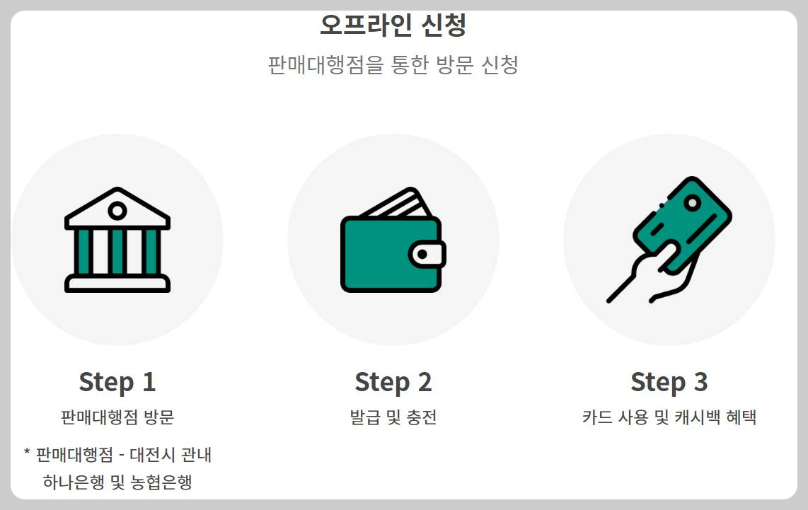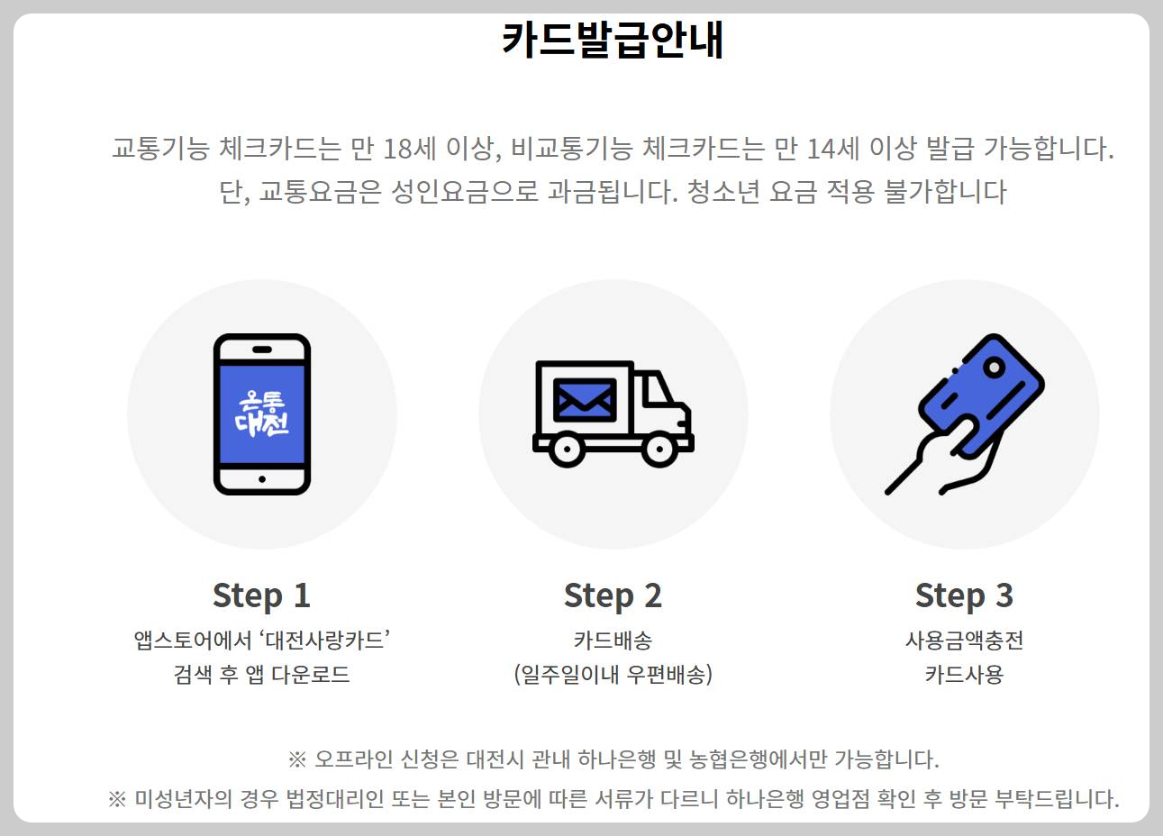 대전사랑카드는 앱을 다운로드하여 온라인으로 휴대폰에 설치하여 사용할 수 있으며 하나은행이나 농협에 방문하여 직접 실물카드를 신청하실 수 있으니 편리한 방법을 선택하시기 바랍니다.