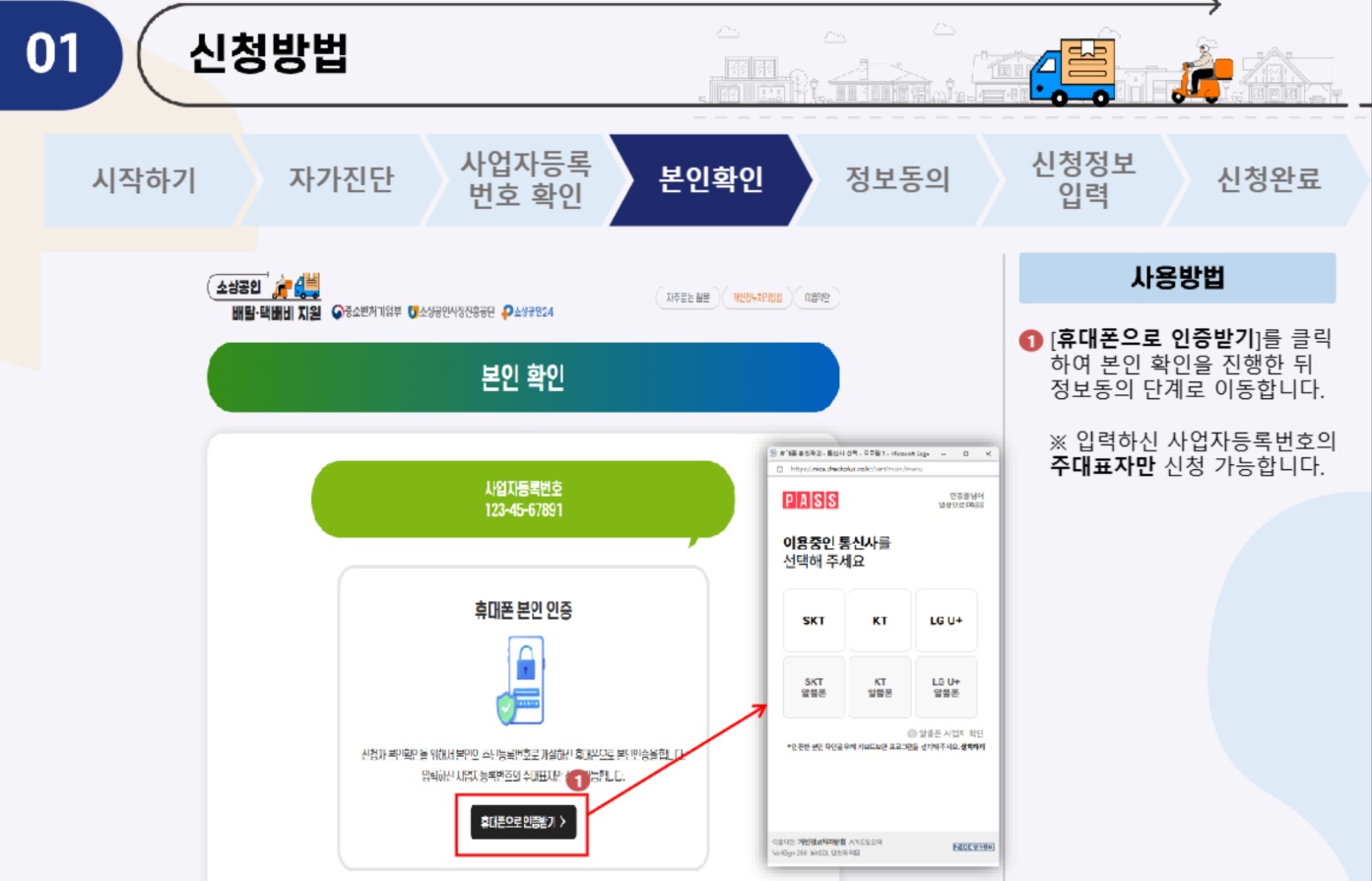 다섯번 째, 휴대폰으로 본인인증을 해 주세요. 사업자등록번호의 주 대표자만 신청할 수 있습니다.