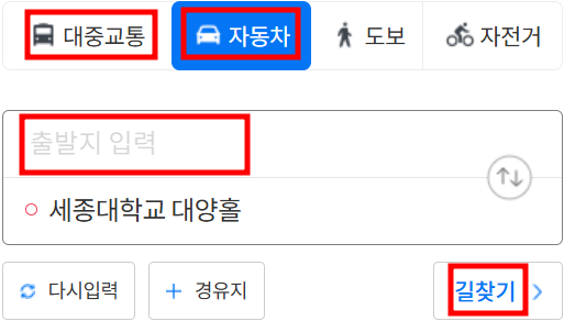 아래 이미지의 대중교통이나 자동차를 선택한 후, 출발지를 입력하고 길찾기를 누르면 자세한 교통편을 볼 수 있습니다.
