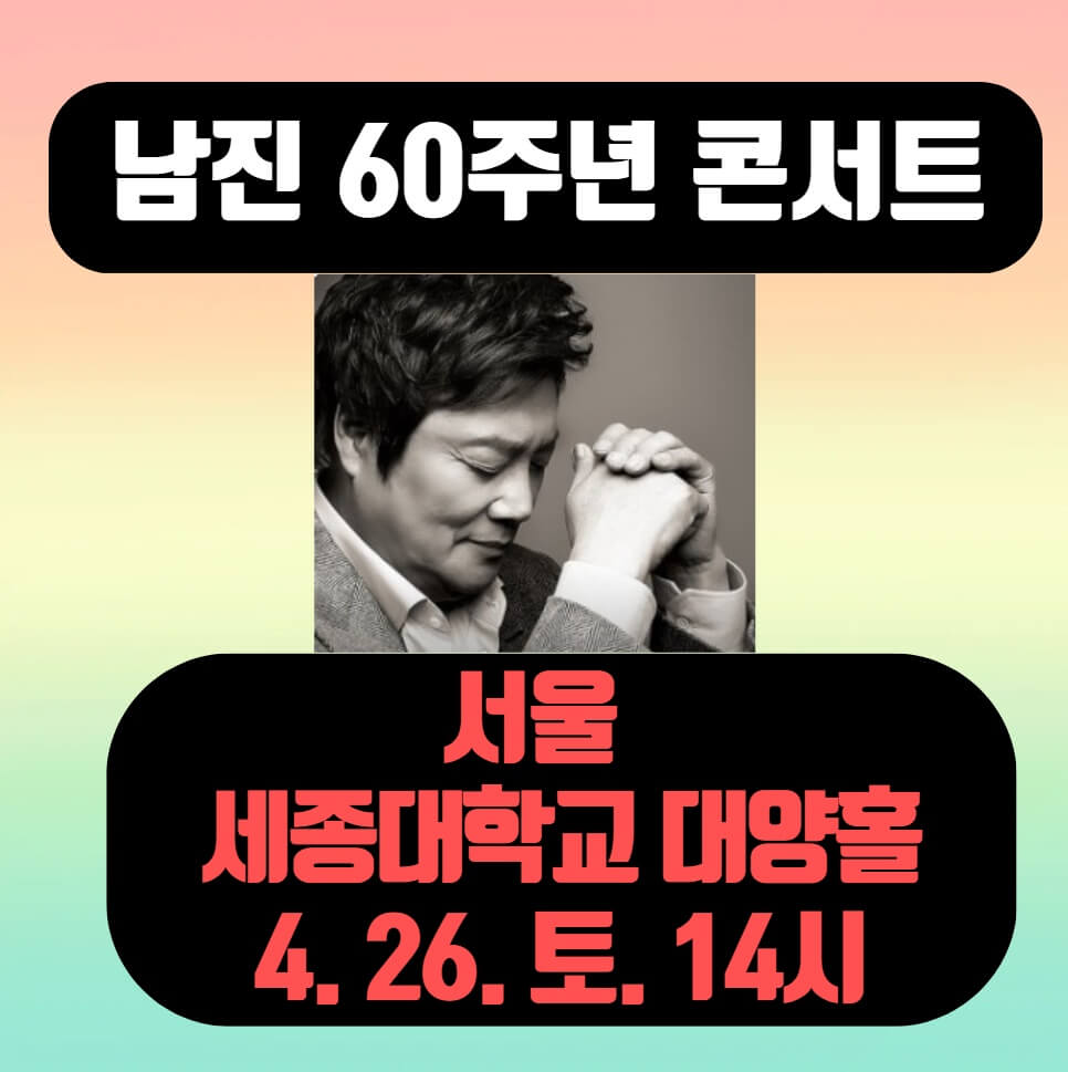 서울 세종대학교 대양홀에서 열리는 남진의 60주년 기념 공연 전국 투어 콘서트, 옛 추억과 감동을 느끼고 싶으신 분들이라면 흔치 않은 기회 놓치지 않으시길 바랍니다. 예매는 아래 링크에서 해주세요.