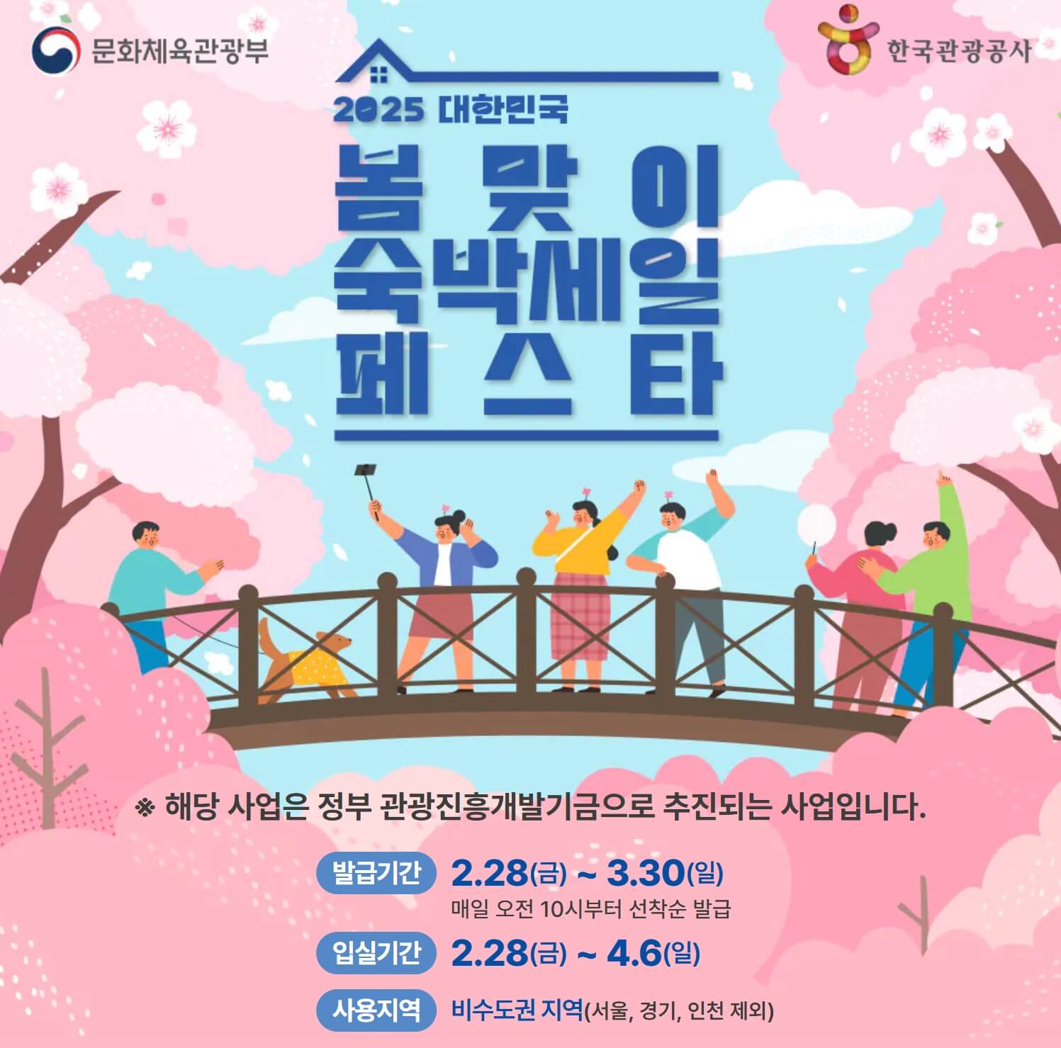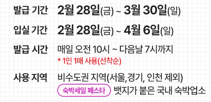- 2. 28(금) ~ 3. 30(일)까지 매일 오전 10시에 숙박할인권 발급.