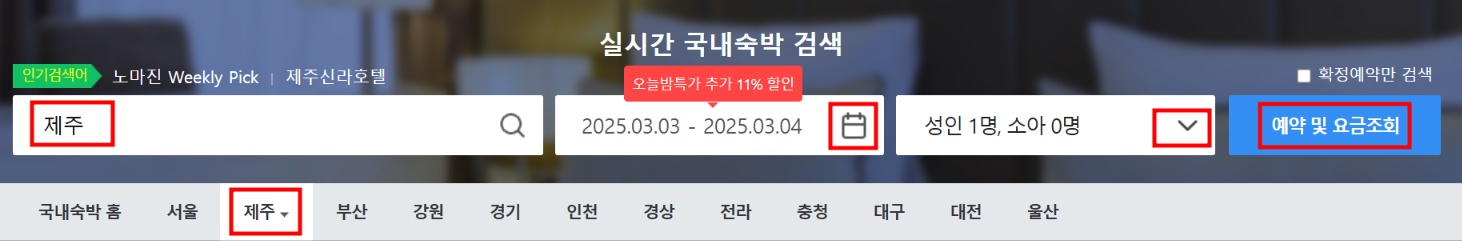 아래 이미지에 붉은 박스를 클릭하면 제주도 최저가 숙소를 검색할 수 있으며, 추가로 최대 13% 할인을 받을 수 있습니다.