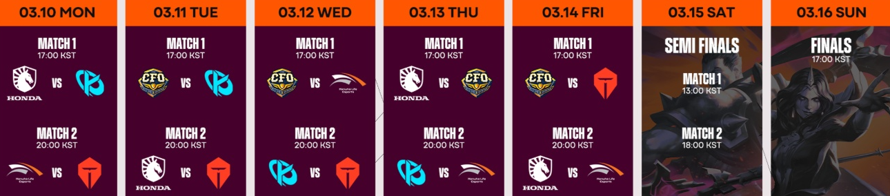 3월 10일부터 14일까지 5개 팀이 돌아가며 한 번씩 3판 이선승제로 진행되며 1경기 진영 선택은 무작위로 결정됩니다. 2 경기에서는 진영을 선택할 수 있고, 나머지 2 경기에서는 랜덤으로 진영이 선택되어 경기를 합니다. 팀마다 4경기를 치른 뒤 5위는 탈락하고 4위까지만 토너먼트 스테이지 진출이 결정됩니다.