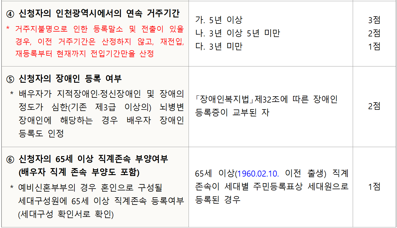 - 가점항목은 신청자가 정확하게 신청하여야 하며, 조사결과에 따라 사실이 아닌 경우 해당 가점은 인정하지 않으며 신청자의 실수로 누락된 가점은 추가 반영되지 않습니다.