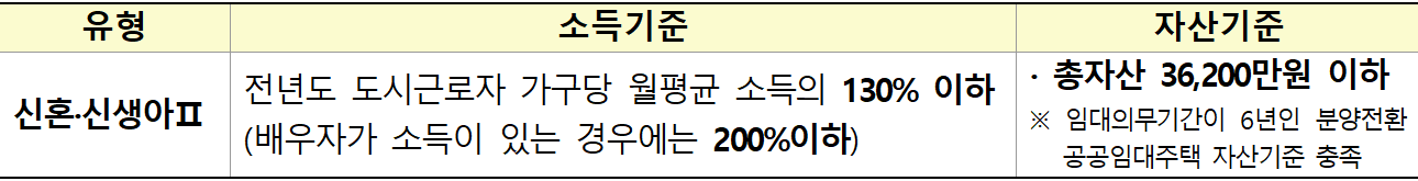 - 수급자, 지원대상 한부모가족, 차상위 계층은 소득, 자산, 검증이 필요 없음(예비 신혼부부 제외)