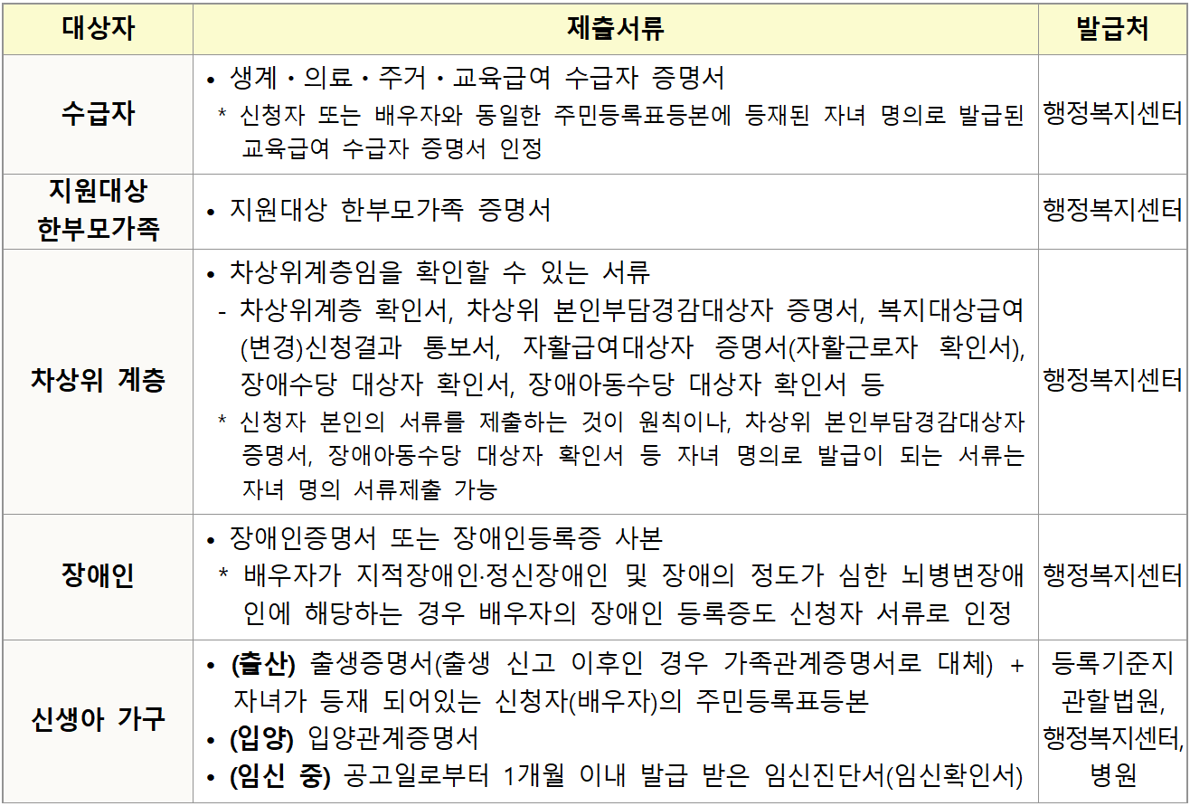 - 추가 제출서류(태아, 입양한 자녀를 인정받아 선정된 경우, 아래 표에 서류 추가 제출)