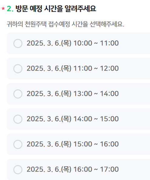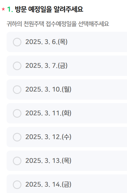 천원주택 신청은 방문접수를 하고 있으며 1일 300건을 방문 예정 날짜와 시간을 온라인으로 사전 예약하여야 신청을 할 수 있기 때문에 마감 전에 서둘러 방문 가능한 시간을 아래에서 예약하시길 바랍니다.