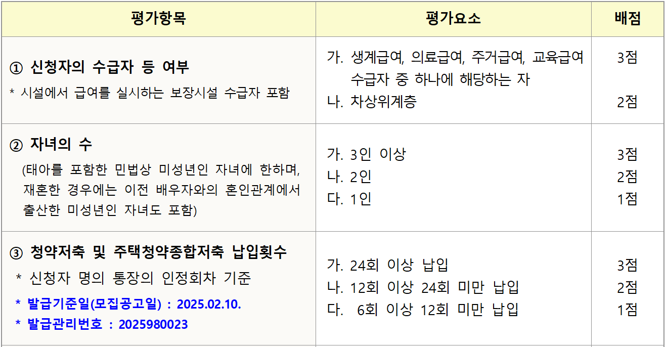 - 동일 점수인 경우 다음 각 호의 순서에 따라 점수가 높은 순으로 입주대상자를 선정하며 경합 발생 시 추첨으로 우선순위가 결정됨