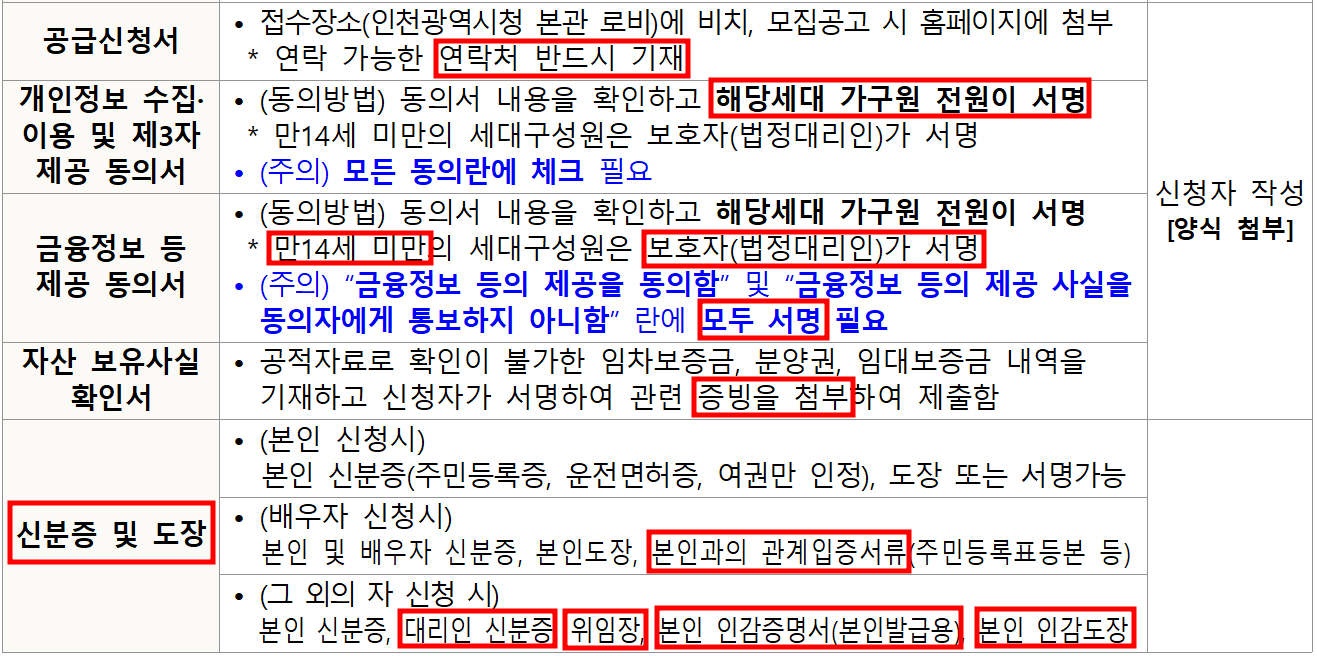 ※ 수급자, 지원대상, 한부모 가족, 차상위 계층은 금융정보 등 제공 동의서, 자산보유사실 확인서 제출 불필요함.(예비 신혼부부 제외)
