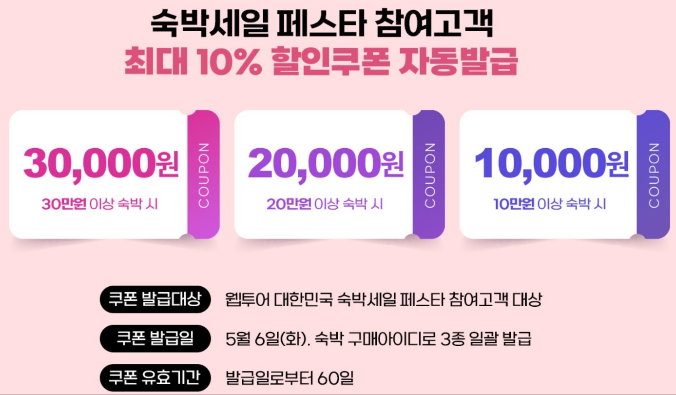 2025. 3. 30(일)까지 매일 오전 10시부터 숙박 할인권이 발급되니, 1박 이상 봄 여행 코스를 원하는 분들은 마감전에 서둘러 혜택 받아보세요.