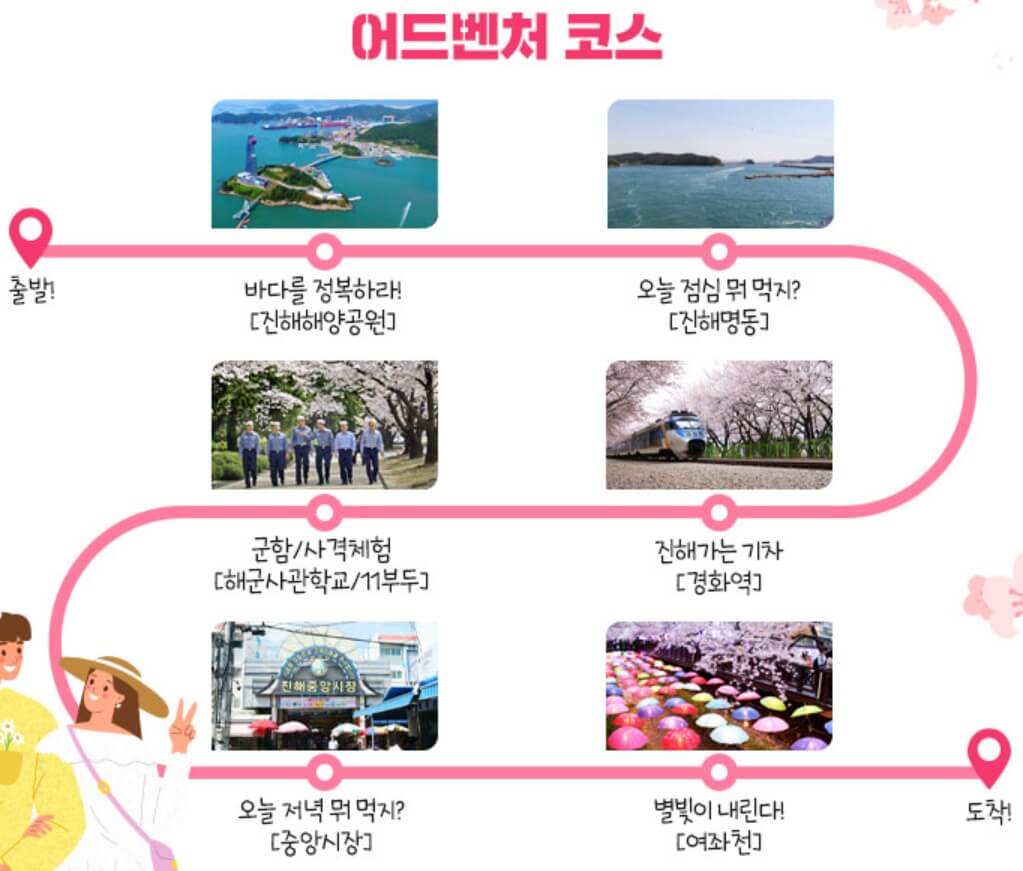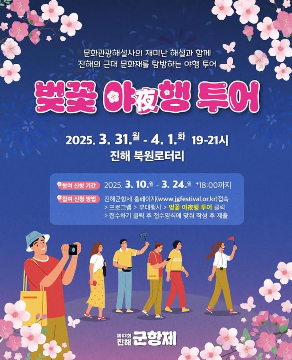 - 신청방법 : 진해군항제 홈페이지(www.jgfestival.or.kr) → 프로그램 → 부대행사 → <벚꽃 야夜행 투어> → 접수하기 클릭 → 구글 폼 신청서 작성