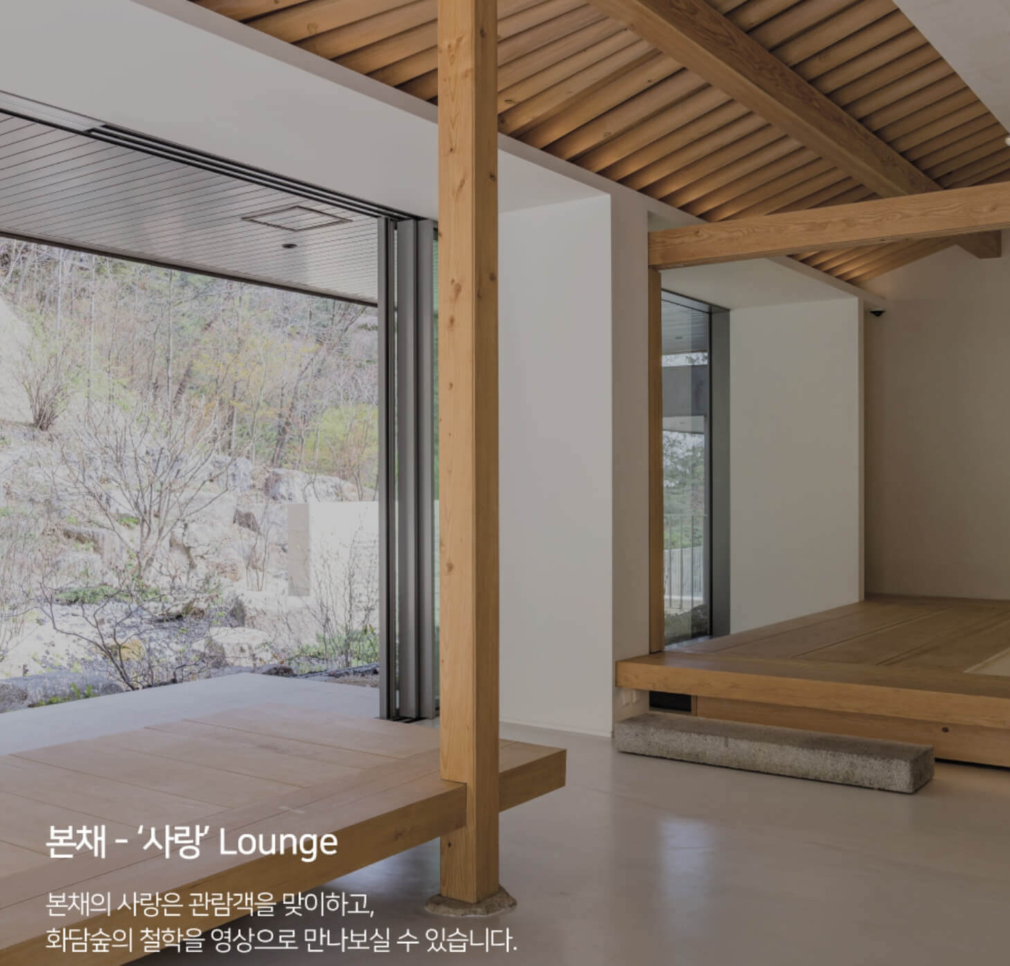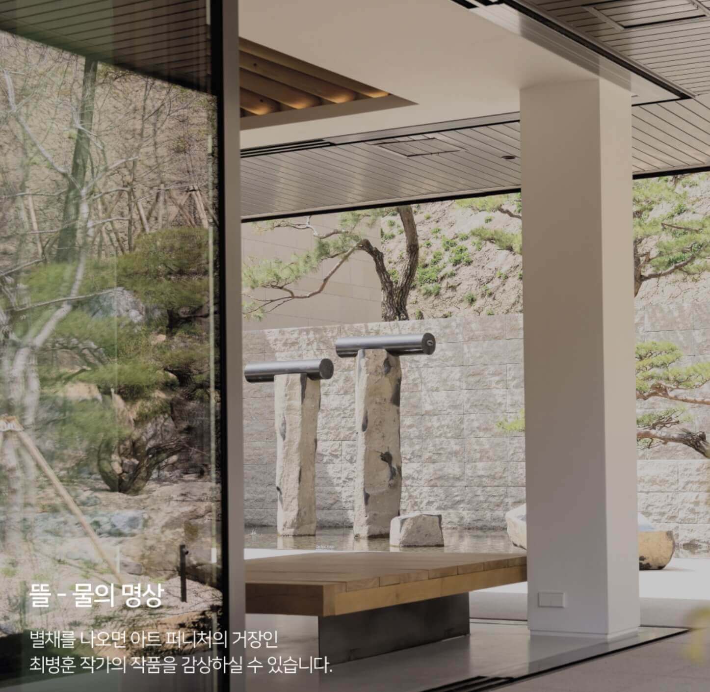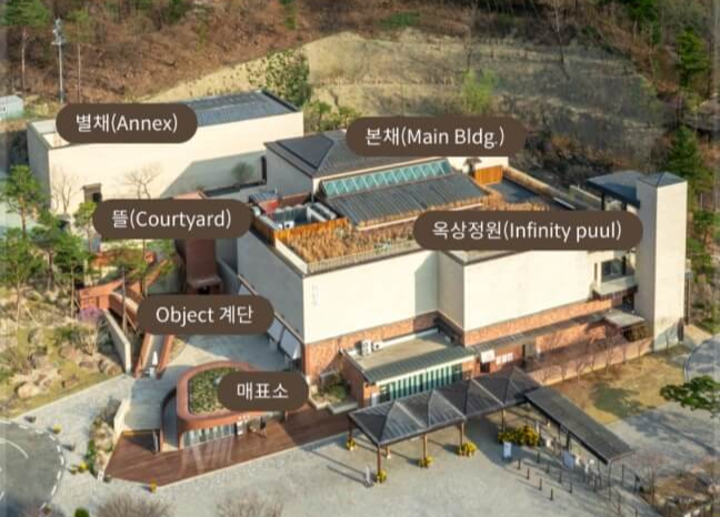 미디어아트를 감상할 수 있는 별채, 다양한 작품을 감상할 수 있는 본채, 옥상정원을 감상할 수 있는 복합문화 공간입니다. 별채 > 뜰 > 본채 > 옥상정원 순서로 관람할 수 있습니다. 화담숲 앱을 이용하시면 작품에 대한 디지털 도슨트를 들을 수 있습니다.