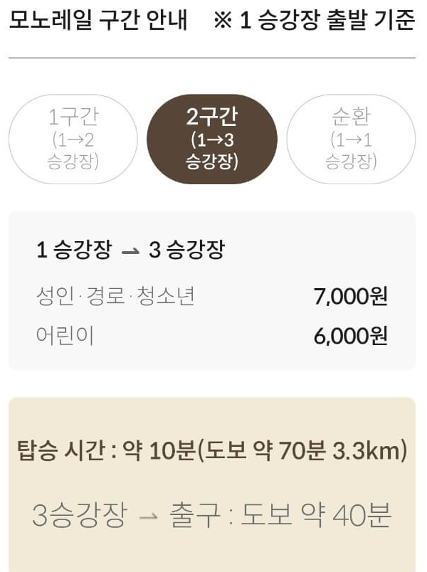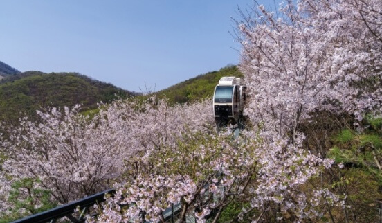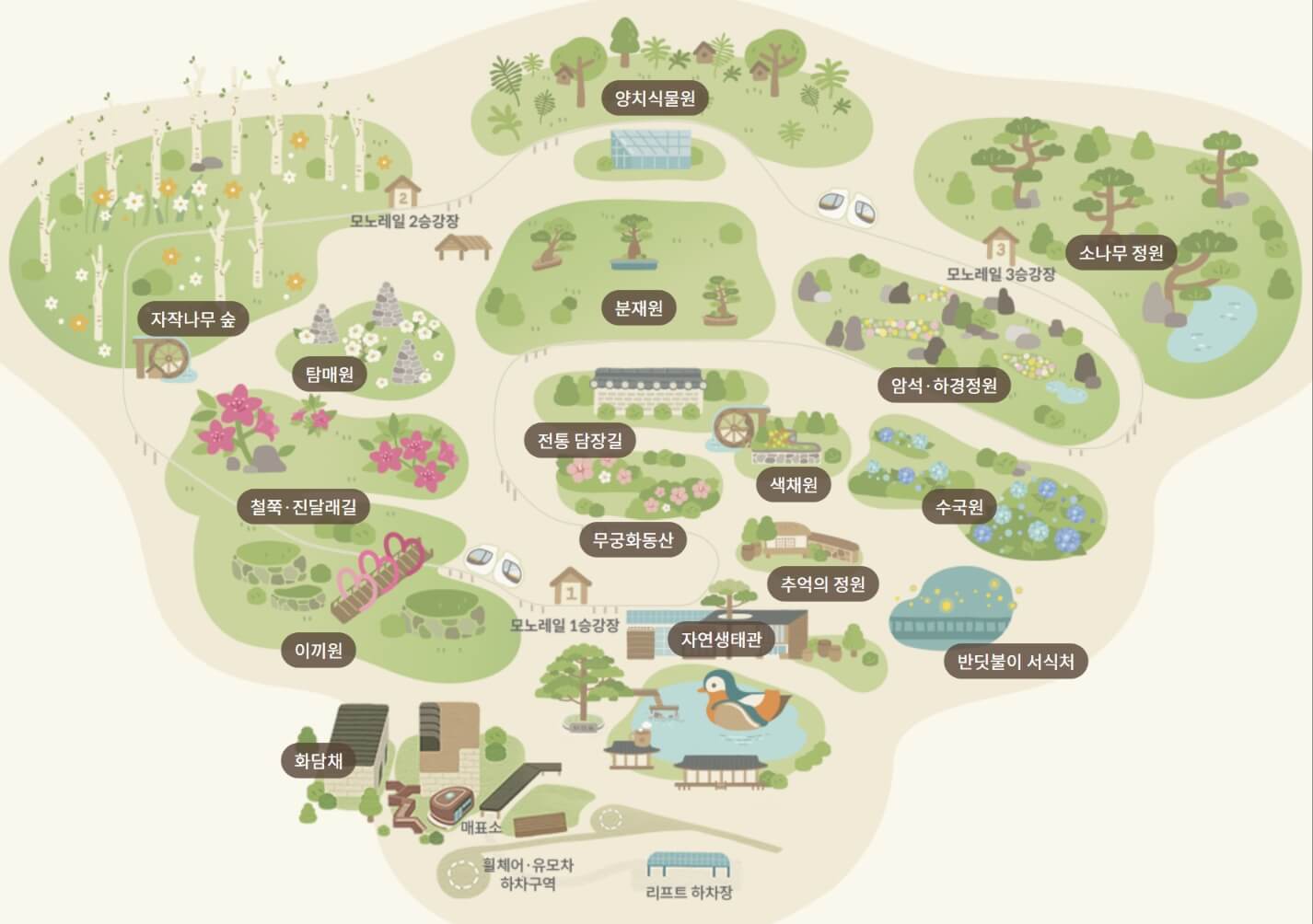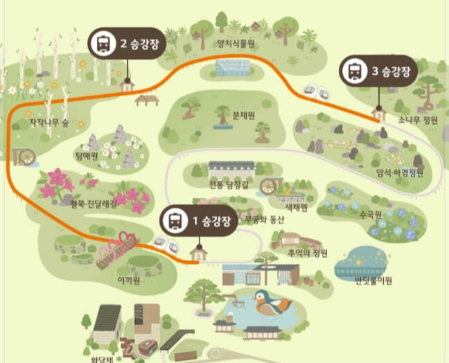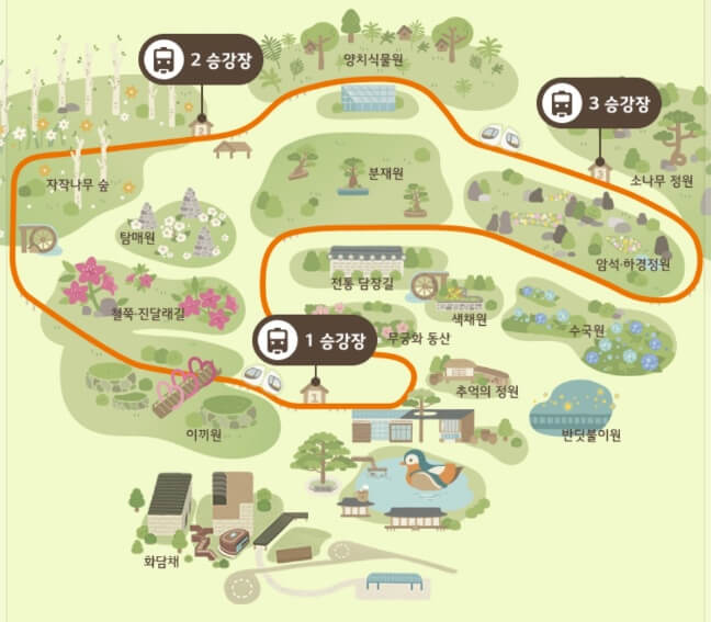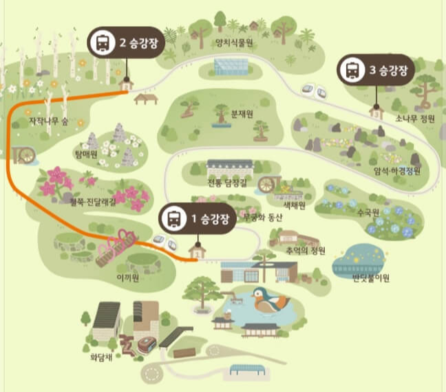 모노레일은 노약자의 편리하고 안전한 관람을 위해 화담숲 서쪽 이끼원 입구 → 화담숲 정상 → 분재원 사이를 지나는 1,213m 순환선입니다.