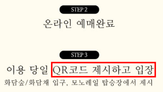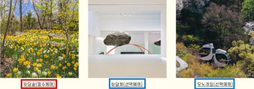 화담숲 입장권은 필수로 예매해야 하며 모노레일과 화담채는 원하는 분들만 선택하여 예매할 수 있습니다.