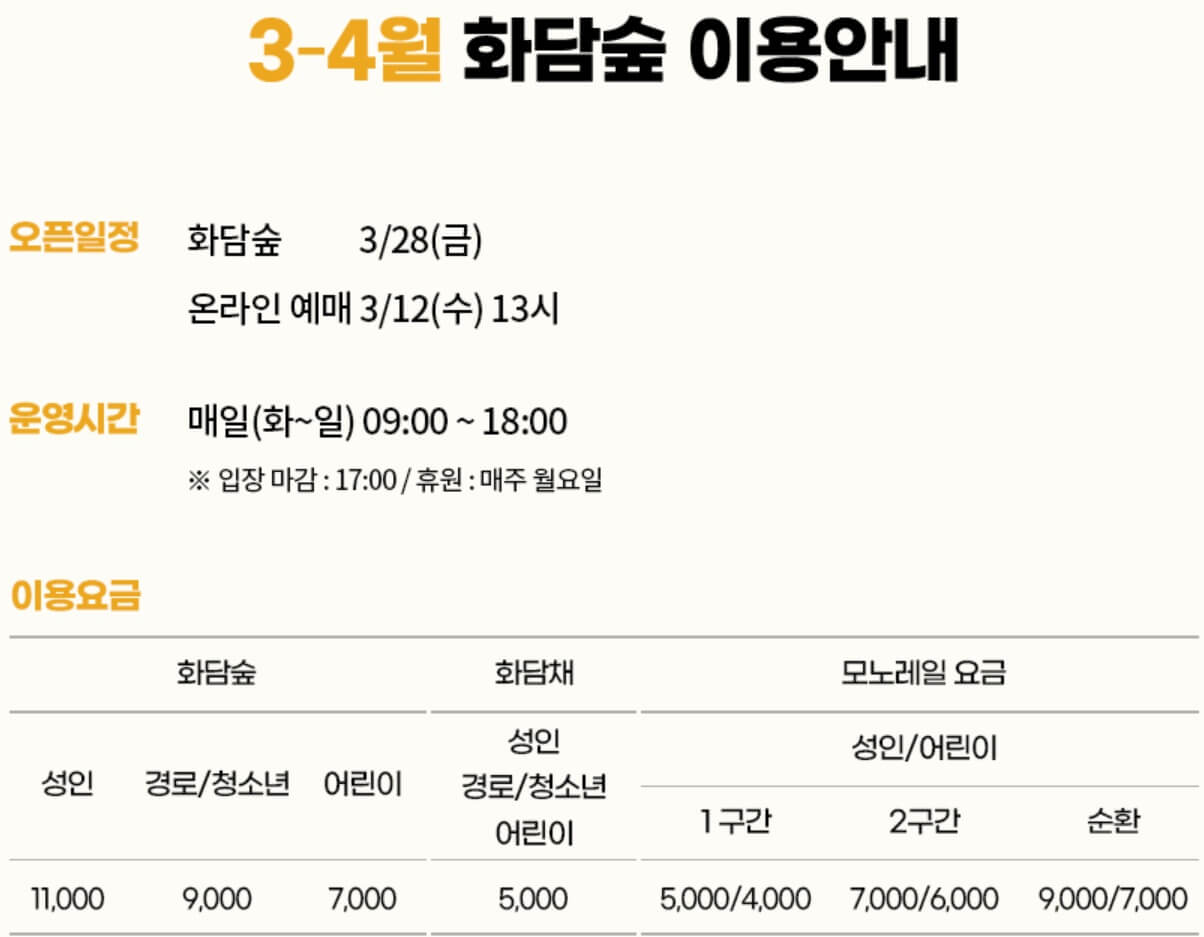 수선화와 벚꽃 등 여러 가지 꽃들과 나무 이끼 등 자연과 함께 힐링할 수 있는 화담숲은 입장권 예매해야만 즐길 수 있는 100% 사전 예약제로 운영되기 때문에 방문 전에 미리 온라인으로 티켓을 예매하여야 합니다.