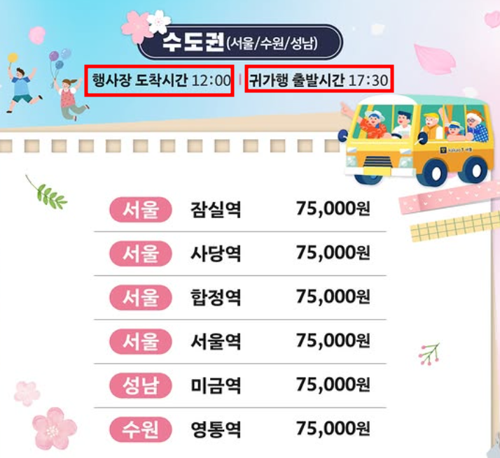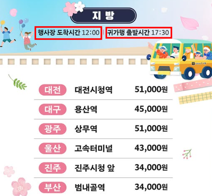 서울과 지방 모두 출발 시간이 다르며 진해 행사장 도착시간은 12시입니다. 귀가행 출발 시간은 모두 17시 30분입니다.