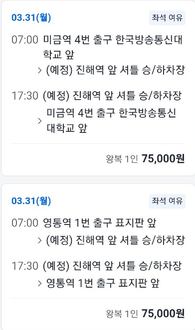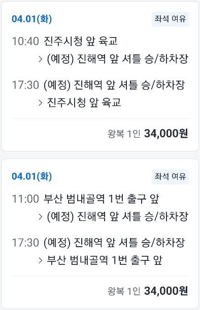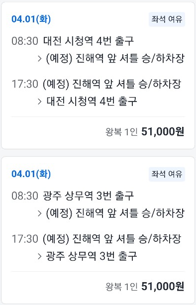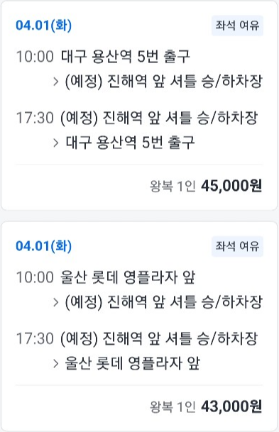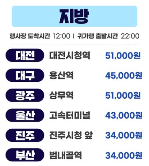 지방 지역별 출발시간 및 가격