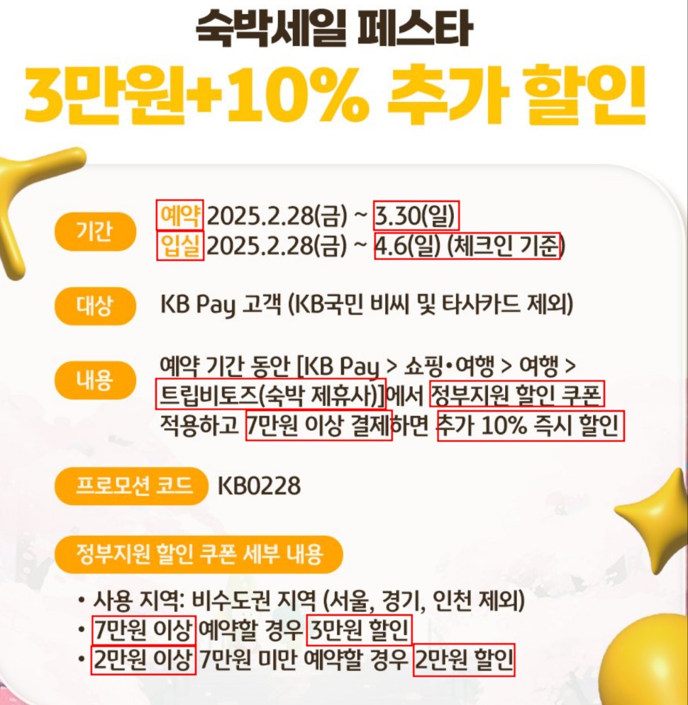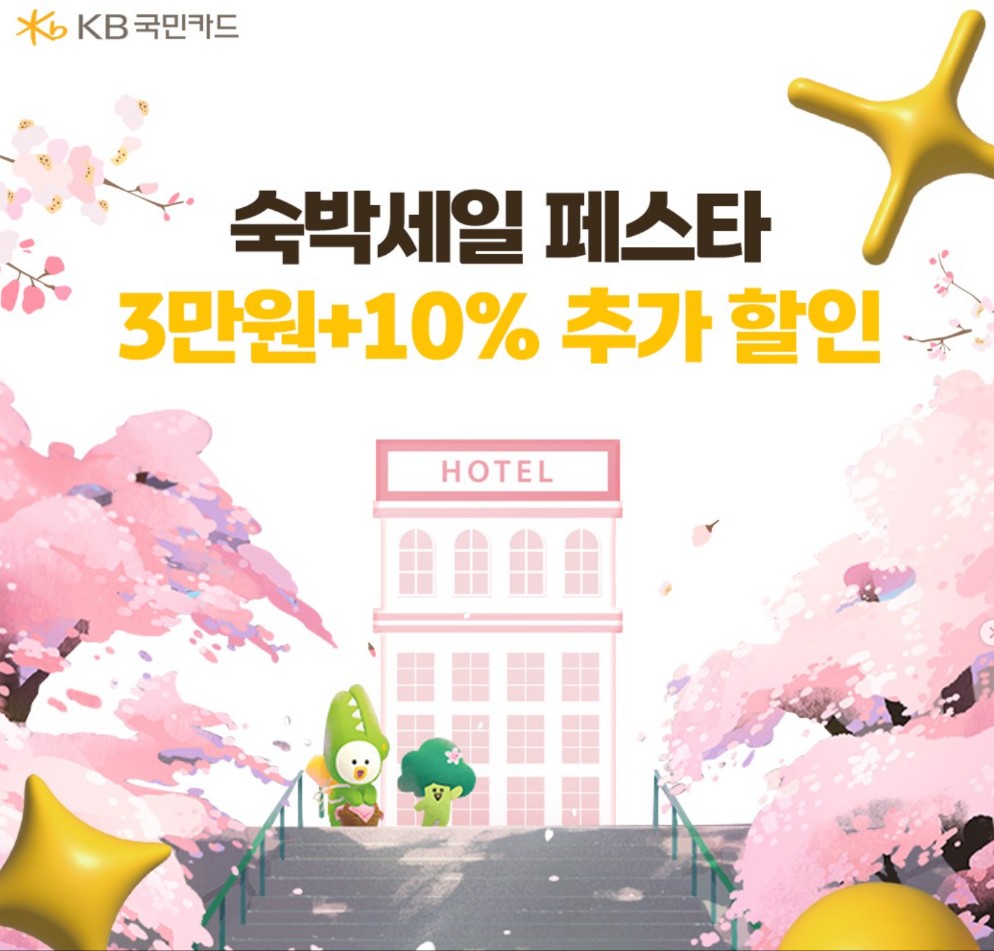 트립비토즈를 통해 숙박할인권을 받고 국민카드를 KB Pay로 결제하면 10% 추가 할인을 받을 수 있습니다.