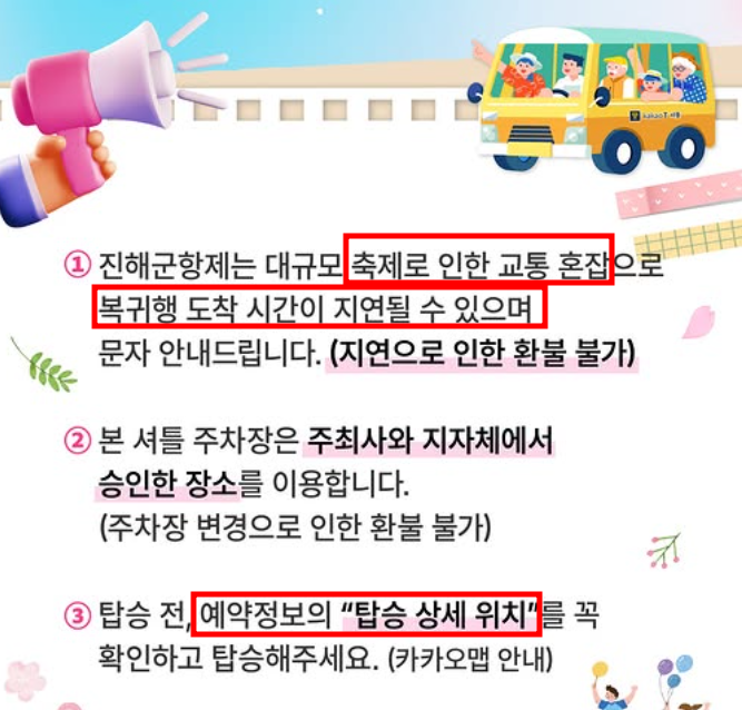 진해 군항제, 체리블라썸 뮤직페스티벌, 군악의 장 당일, 1박 카카오 T 앱 셔틀버스 예약