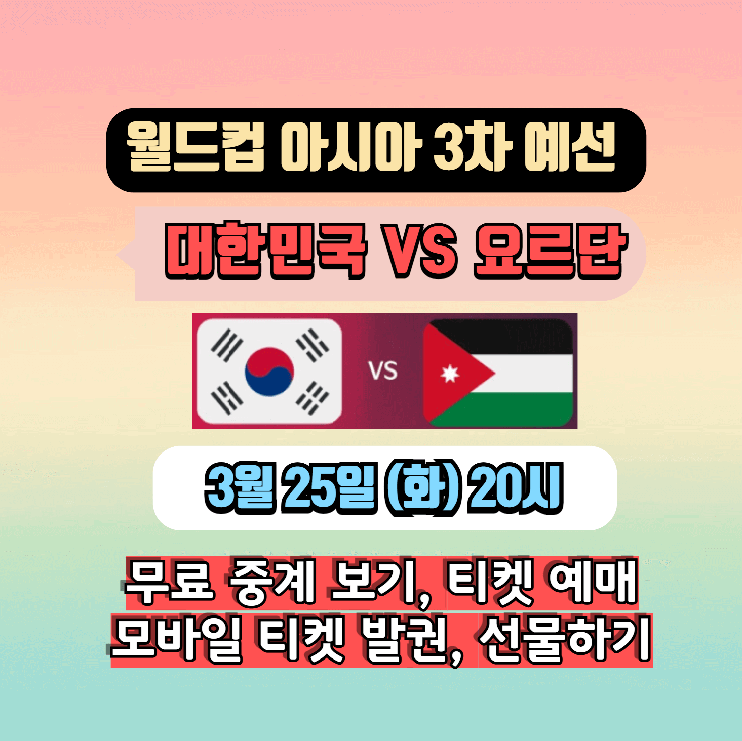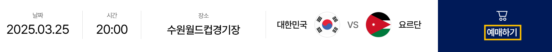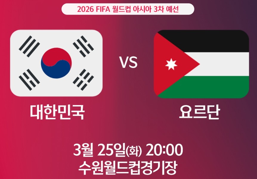 2026 FIFA 월드컵 아시아 3차 예선 대한민국 VS 요르단 축구 경기가 오늘 3.25(화) 20시 수원월드컵경기장에서 열립니다. 아직 잔여석과 취소표의 예매가 가능하니 직접 관람을 원하시는 분들은 아래에서 티켓을 예매하세요.