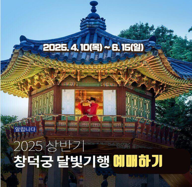 100% 사전예약제로 진행되는 2025년 상반기 창덕궁 달빛기행에서는 해설사와 함께 창덕궁의 야경을 즐기며 산책하고 전통차를 마시며 전통예술공연을 감상하는 프로그램입니다.