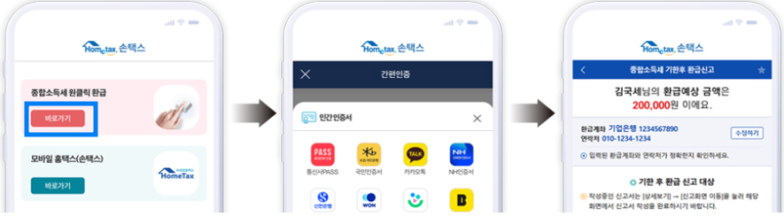 국세청 홈택스 앱을 열어 위 파란 박스처럼 종합소득세 원클릭 환급을 선택하고 간편 인증을 하면 환급 예상금액이 있으면 위 3번째 이미지처럼 확인할 수 있습니다.