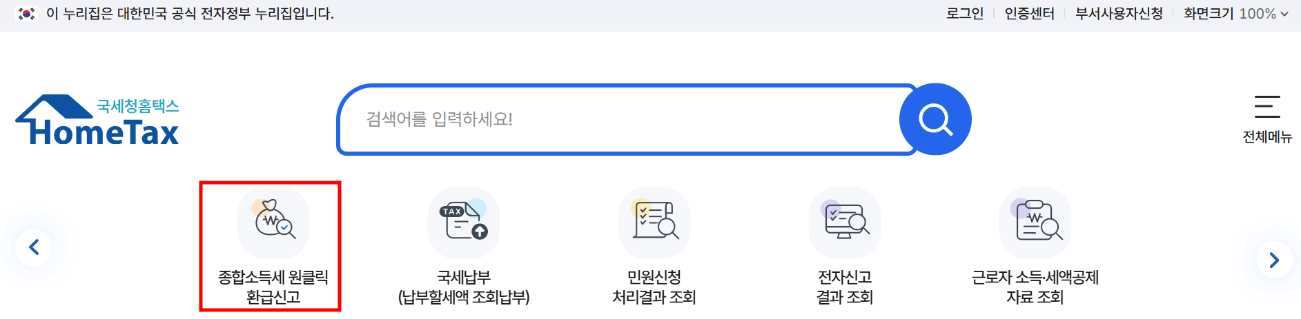 아래 링크를 통해 국세청 홈택스로 이동하면 아래 이미지의 붉은 박스에 있는 종합소득세 원클릭 환급신고를 클릭하고 간편 인증을 진행하면 예상환급금을 확인할 수 있습니다.