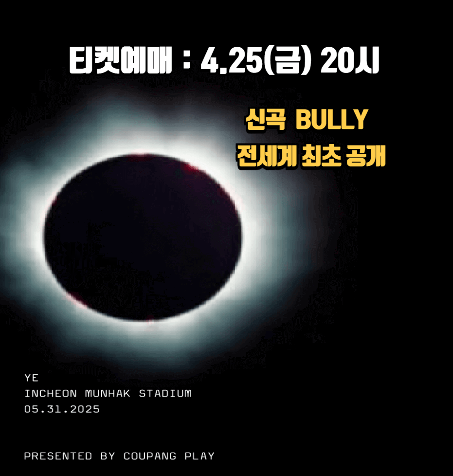 YE(칸예 웨스트) 내한 공연이 인천문학경기장에서 열립니다. 이번 콘서트는 신곡 ‘BULLY’의 세계 최초 라이브 무대가 펼쳐지는 특별한 순간으로, 모바일 쿠팡플레이 앱에서만 예매할 수 있고 쿠팡 와우회원만 티켓팅 할 수 있으니 아래 링크에서 미리 다운로드하여 준비하시기 바랍니다.