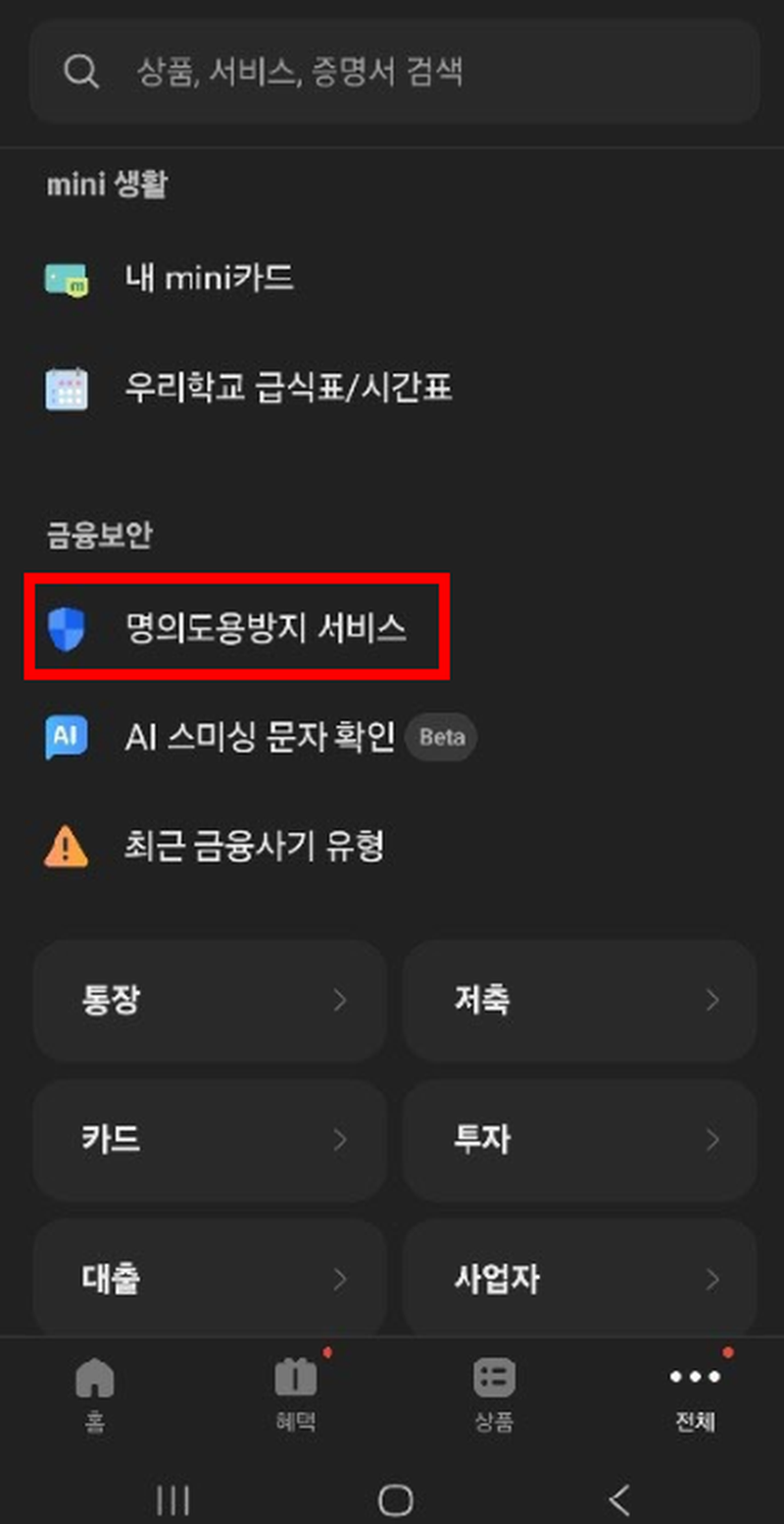- ‘인증/보안’ → ‘금융사기예방’ 진입
