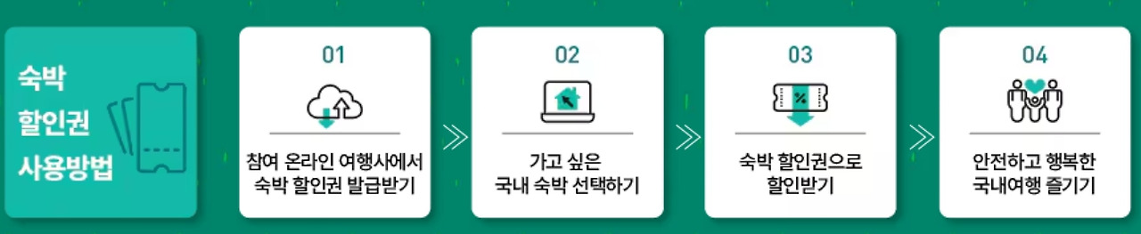 할인권은 참여 온라인 여행사에서 발급받은 후, 해당 사이트에서 원하는 숙박시설을 선택하여 예약 시 적용할 수 있습니다. 단, 관광진흥법, 공중위생관리법 등에 등록된 국내 숙박업소에서만 사용 가능하며, 대실, 캠핑시설, 외국인도시민박업 등은 제외됩니다.