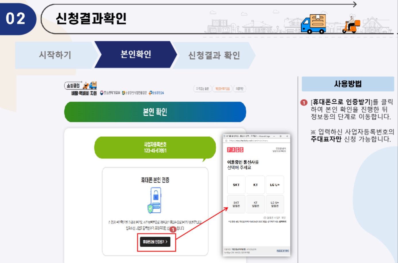 다섯번 째, 휴대폰으로 본인인증을 해 주세요. 사업자등록번호의 주 대표자만 신청할 수 있습니다.