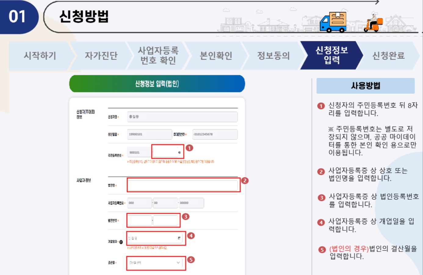 일곱 번째, 신청자의 주민등록번호, 생년월일, 법인명, 사업자 등록번호, 개업일 등을 입력합니다.