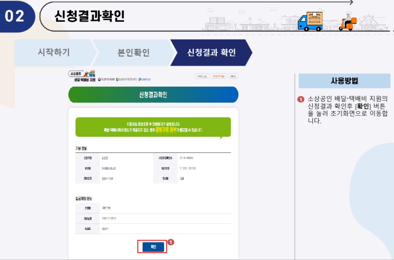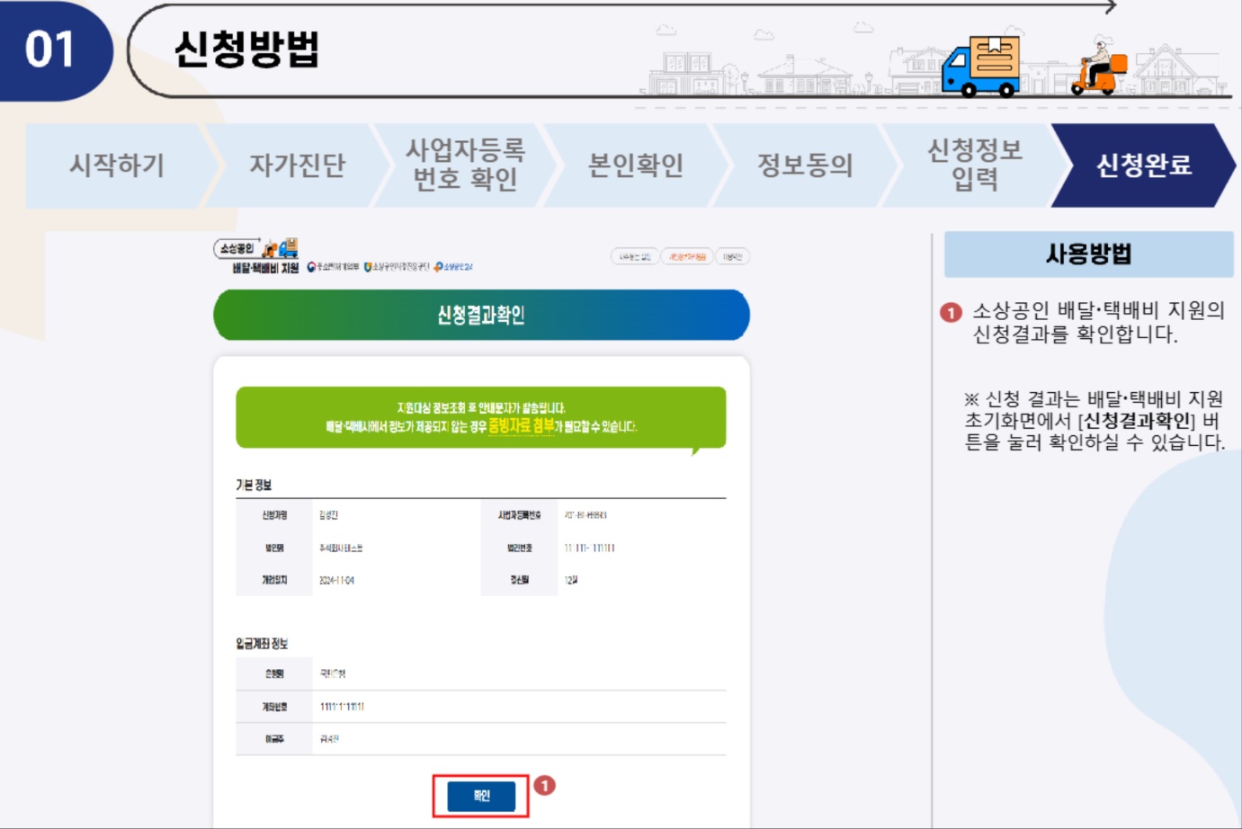 아홉 번째, 입력한 개인정보와, 사업자등록번호, 입금 계좌 정보가 맞는지 확인합니다.