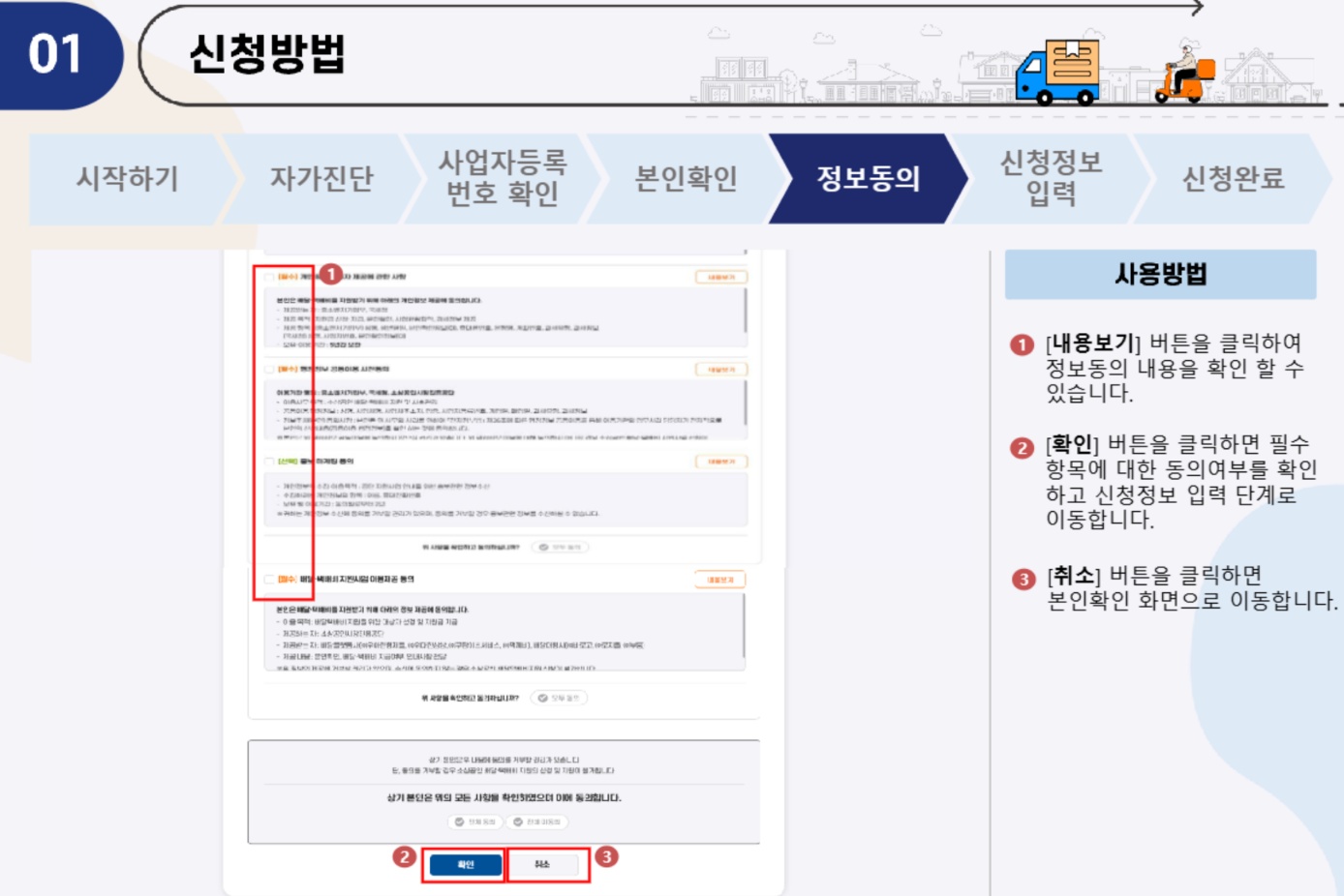 여섯 번째, 필수동의 사항에 확인을 클릭하시고 제일 하단의 확인을 클릭하세요.