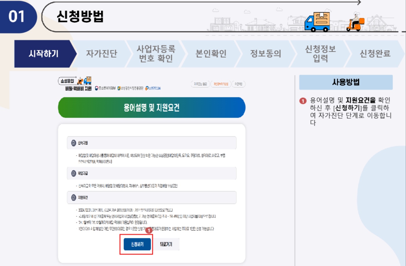 둘째, 용어설명 및 지원요건을 읽어보신 후 제일 하단의 신청하기를 클릭하세요.