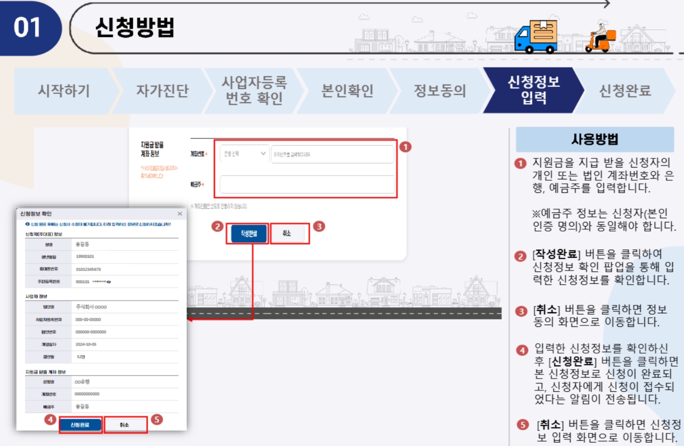 여덟 번째, 지원금을 받을 계좌번호와 은행을 입력하고 작성완료를 클릭합니다.