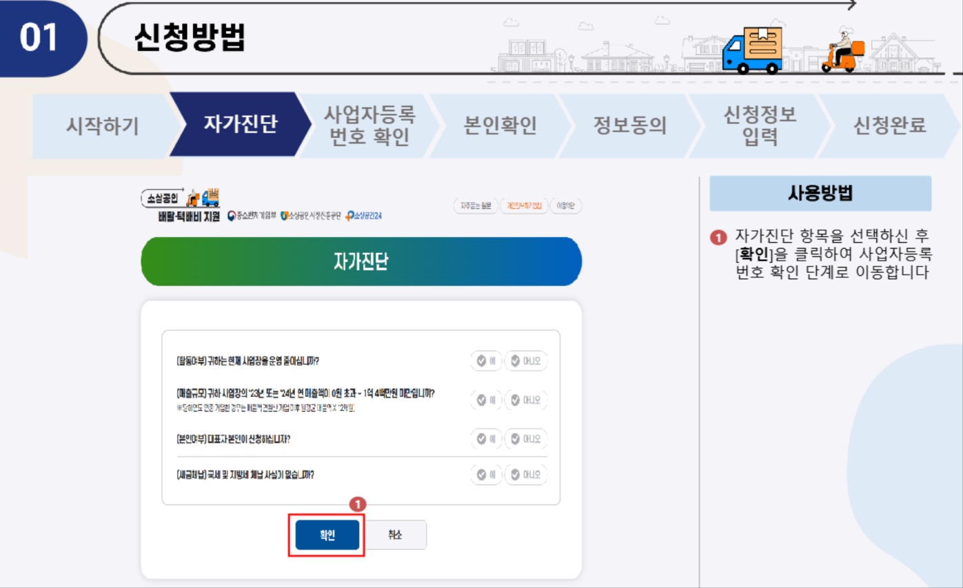 세 번째, 자가진단의 물음에 '예'를 선택하세요. 아니오가 있으면 다음으로 진행되지 않습니다.